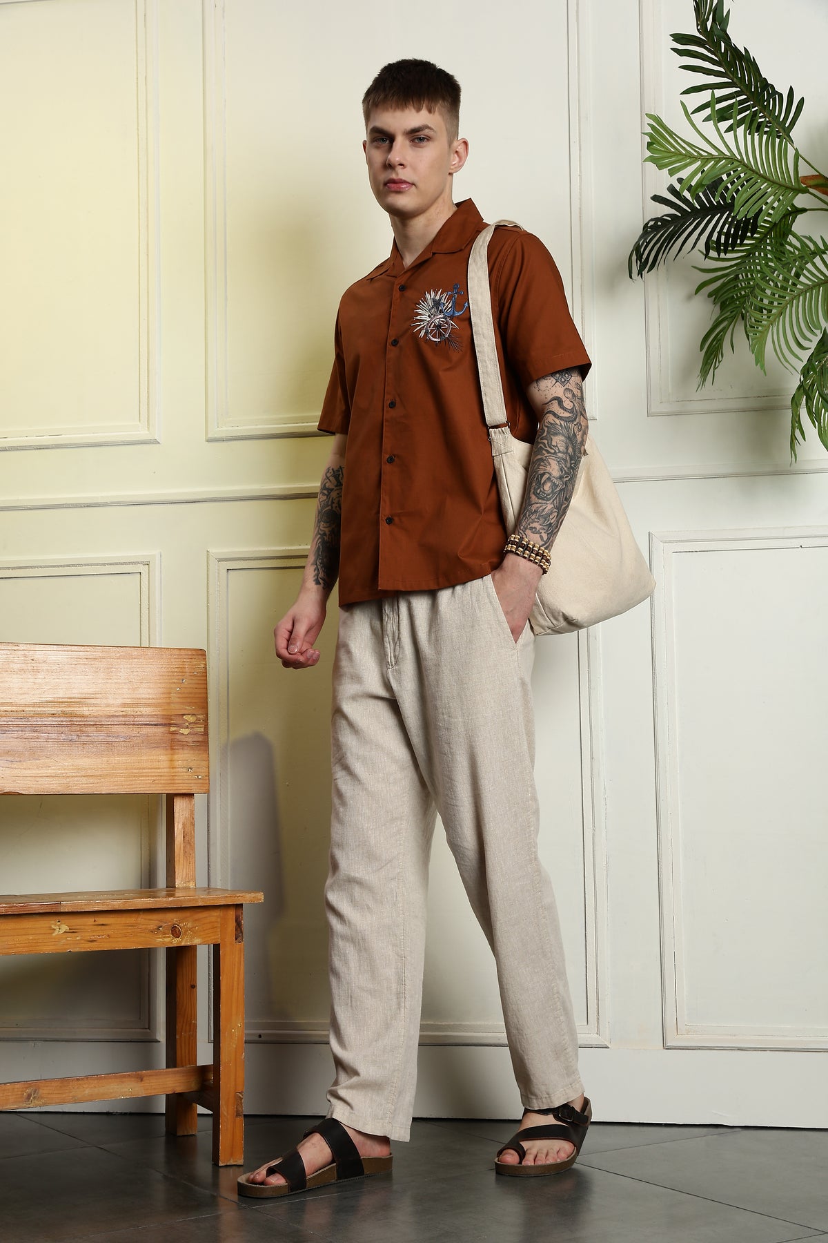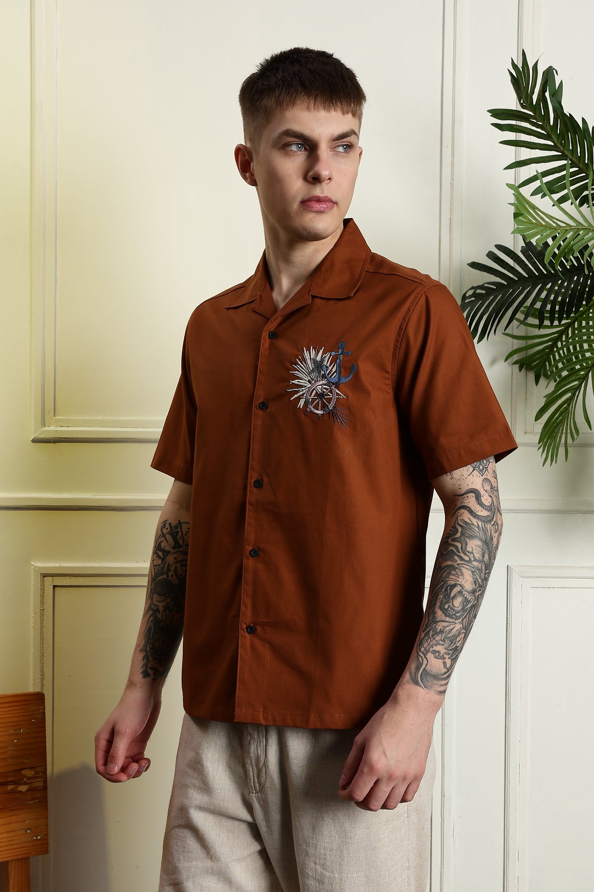 Anchor: Embroidery Brown Cuban Shirt