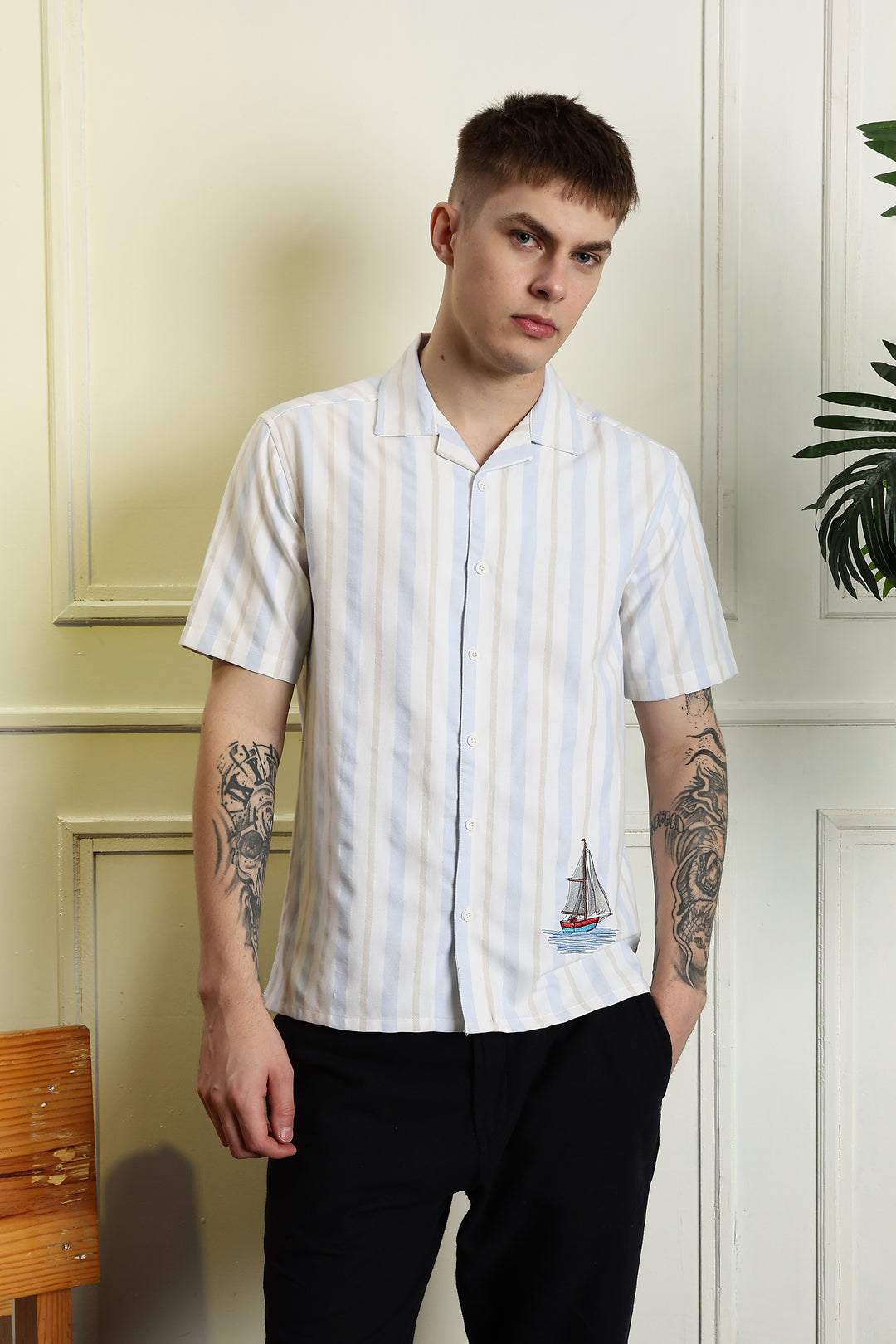 Stripes: Blue Coconut Embroidery Cuban Shirt
