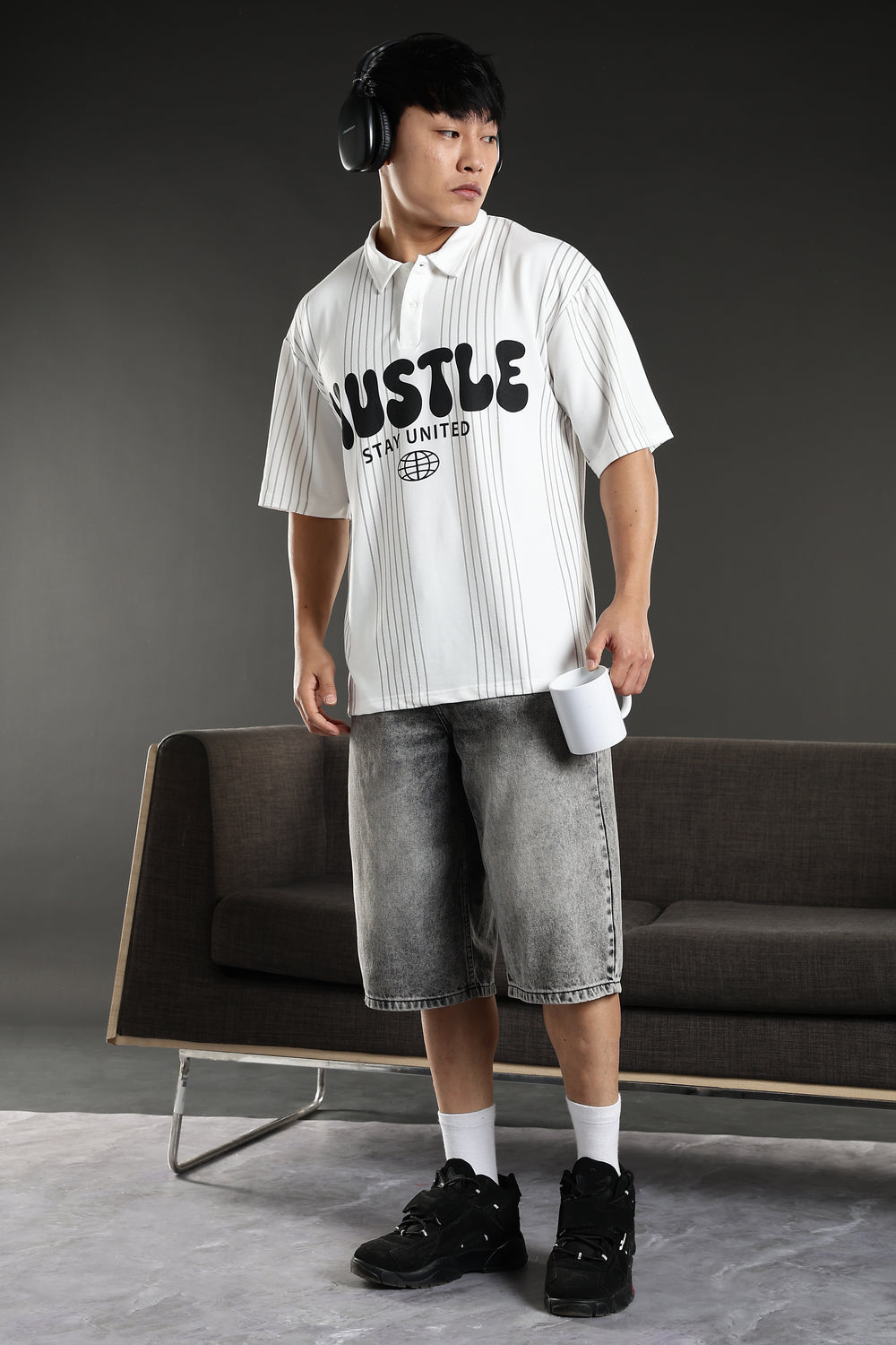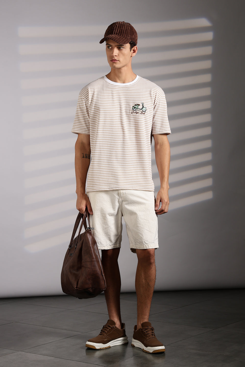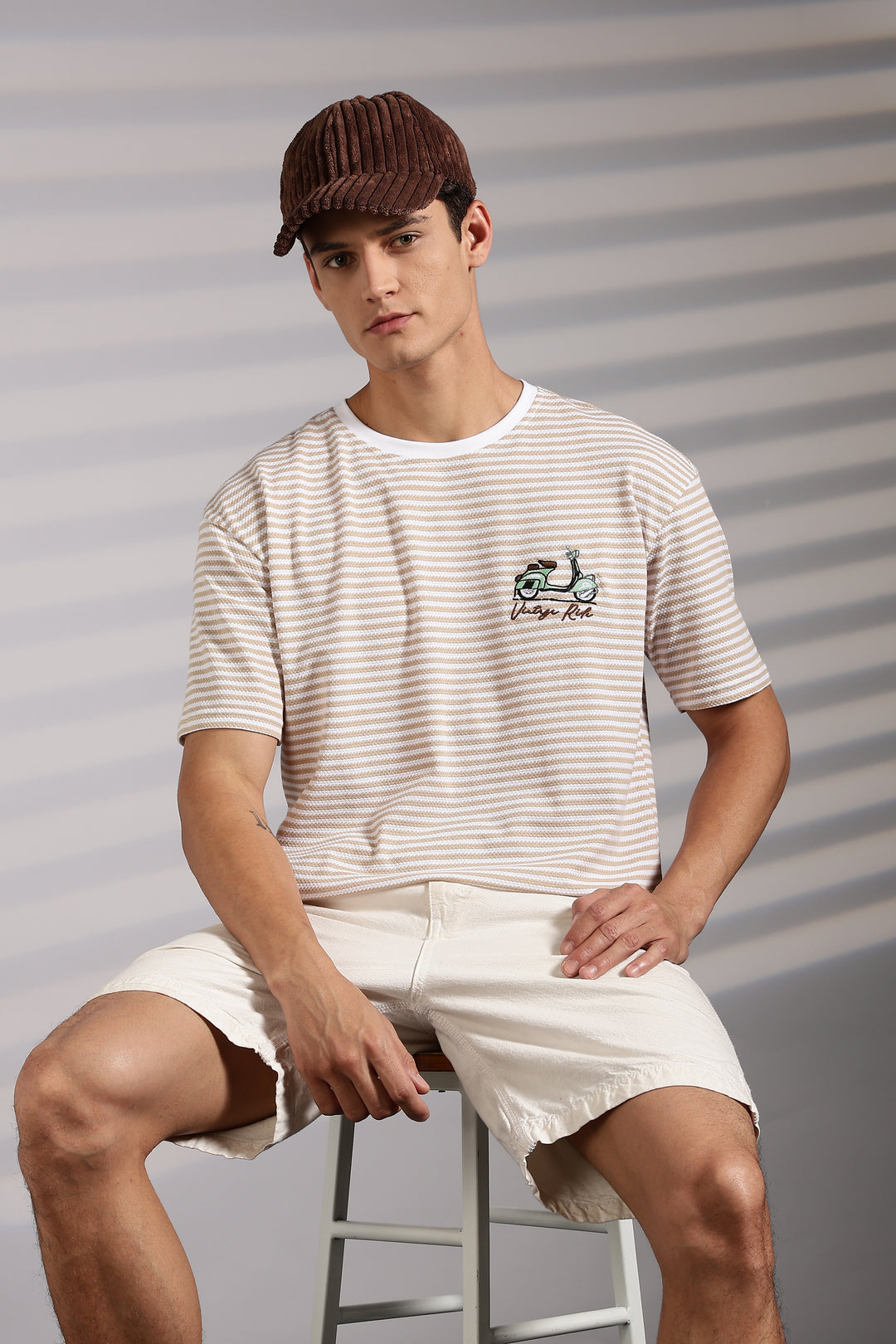 Vintage Ride: Embroidered Cream Stripes Oversized T-shirt