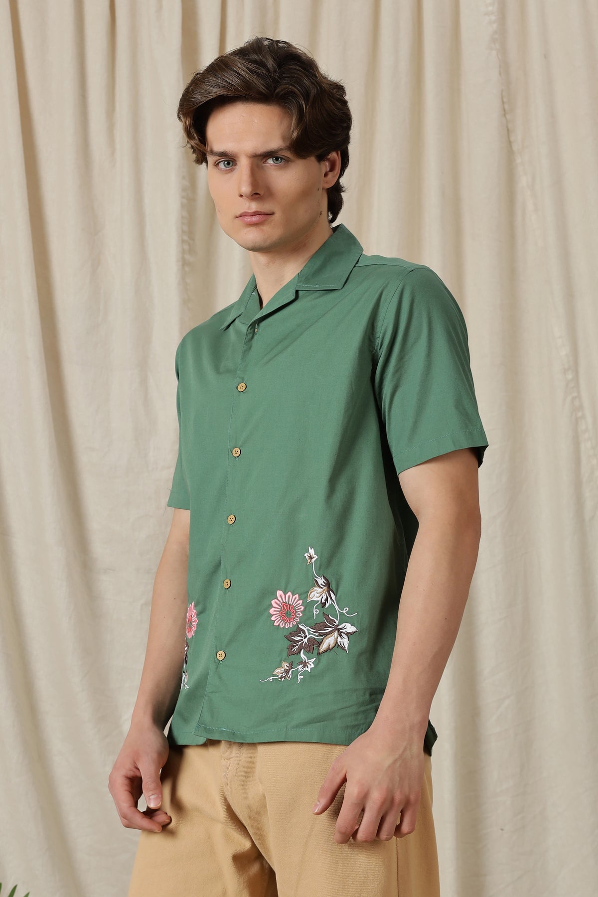 Introducing our Autumn Flowers: Green Cuban Shirt, where timeless elegance meets vibrant charm. Crafted with meticulous attention to detail, this shirt is a celebration of exquisite craftsmanship and tropical allure.