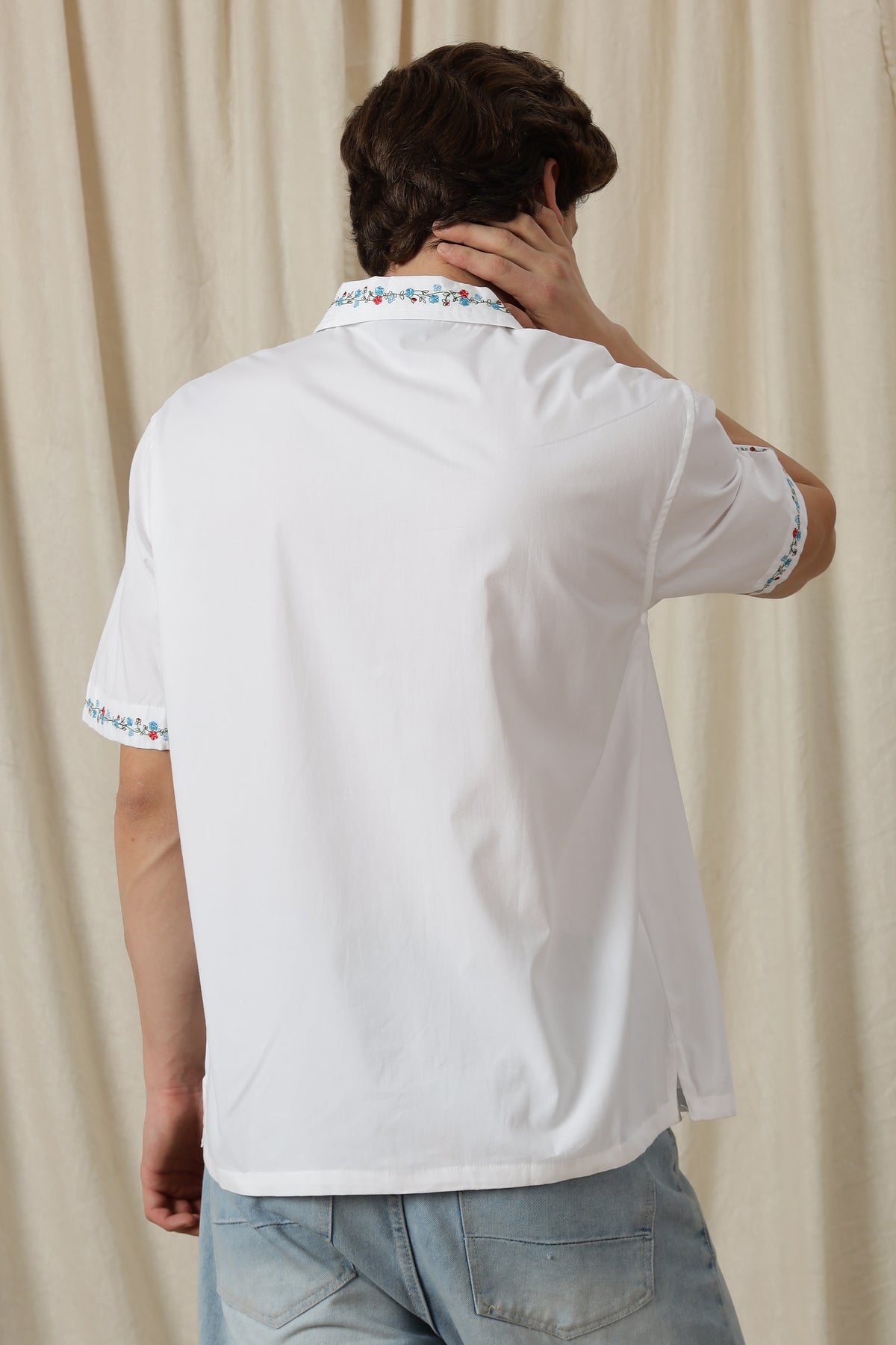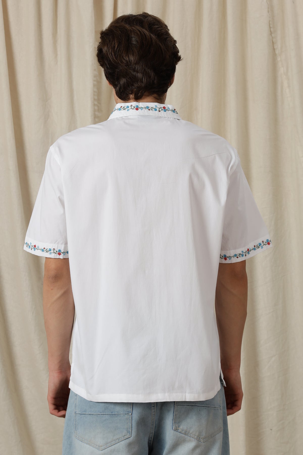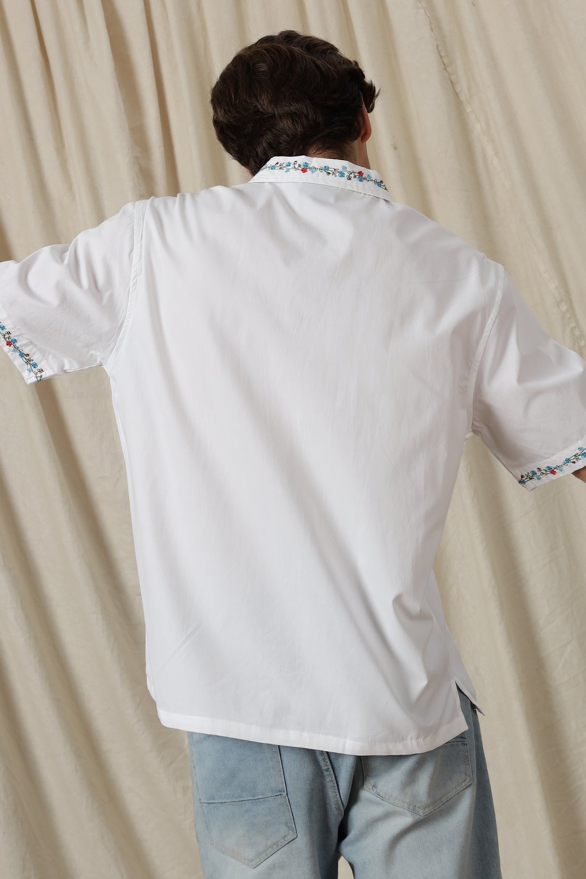 The standout feature of this shirt is its stunning floral embroidery, meticulously stitched to perfection. Each flower and leaf intricately detailed, adding a touch of sophistication to its relaxed silhouette.
