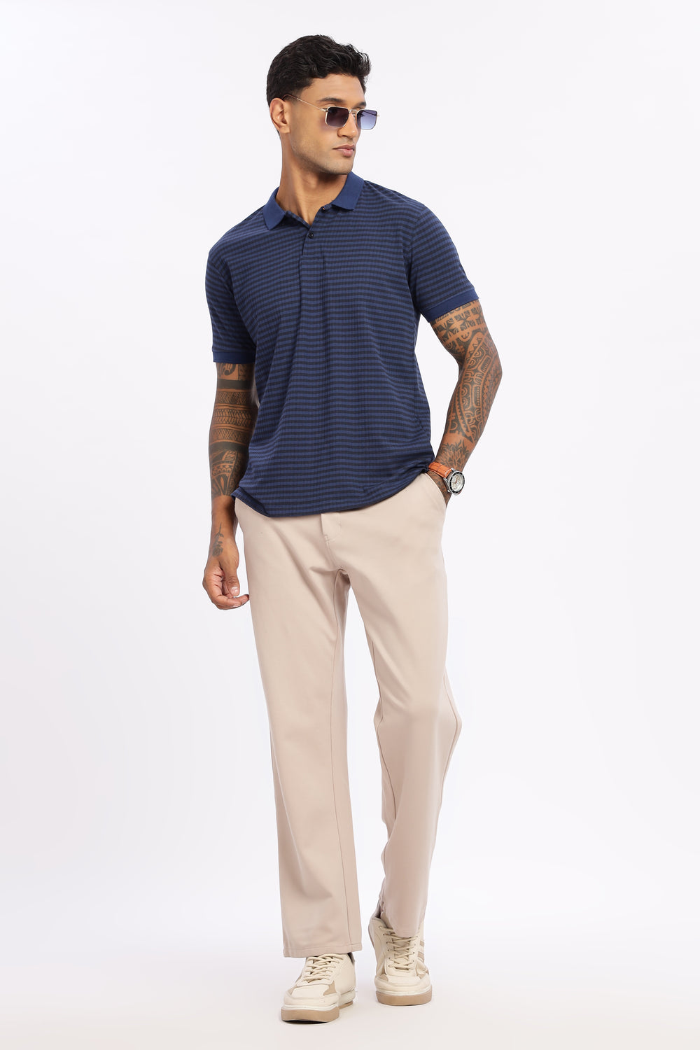 Blue Stripes Polo T-shirt brings a fresh twist to a timeless classic. Featuring subtle horizontal stripes on a soft cream base, this polo blends casual comfort with smart style. Crafted from breathable, cotton-rich fabric, it offers a smooth feel and all-day ease. The structured collar and button placket lend a polished touch, while the clean stripe pattern adds visual interest without overpowering your look. Ideal for weekend outings, casual Fridays, or laid-back evenings.
