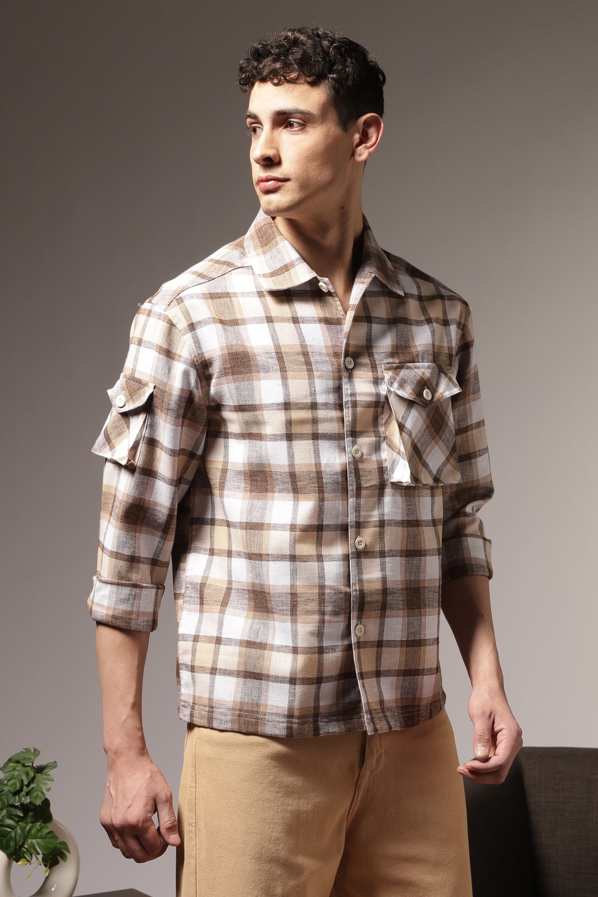 Plaid: Brown Checks Cargo Pocket Shirt