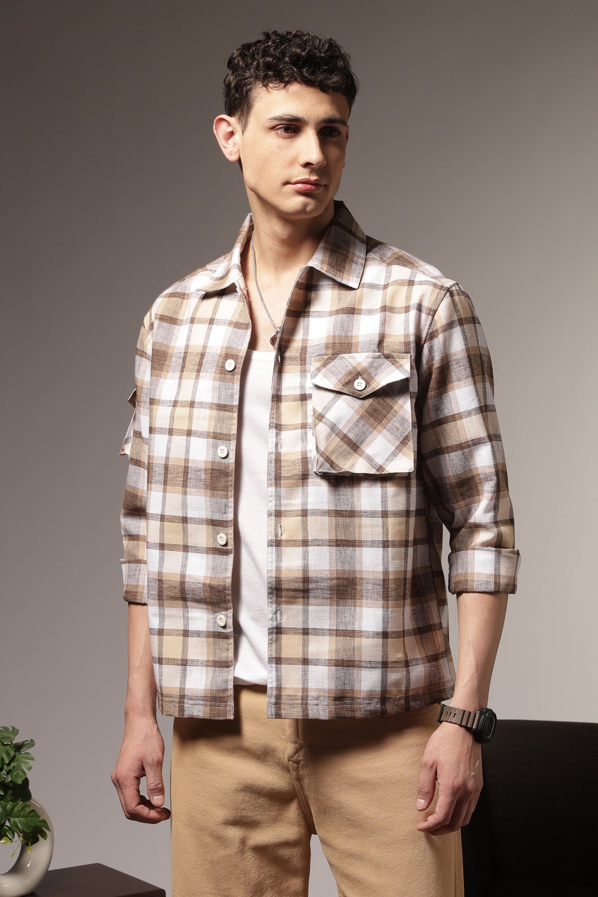 Introducing our Plaid: Brown Checks Cargo Pocket Shirt – a fusion of sophisticated style and Cuban-inspired flair, this overshirt is a statement piece designed to elevate your wardrobe. Meticulously crafted with a unique contrast stitching pattern, this overshirt exudes both modern urban charm and timeless elegance.