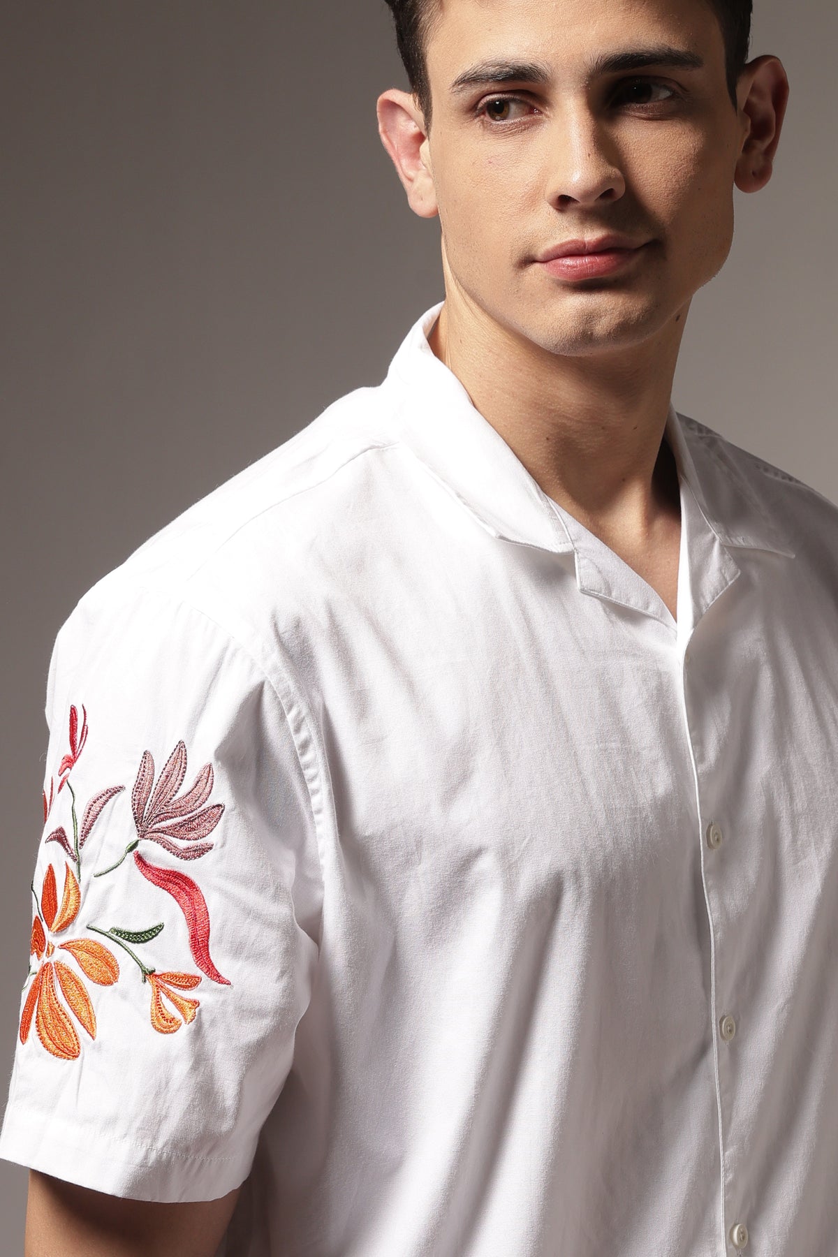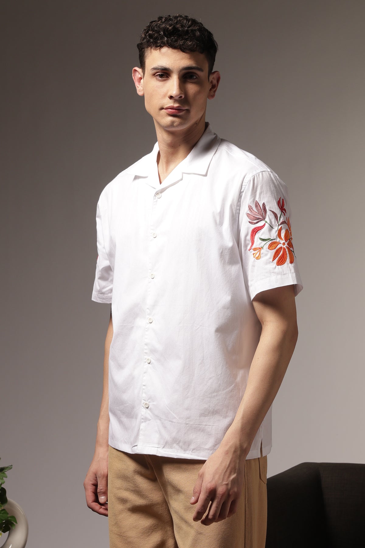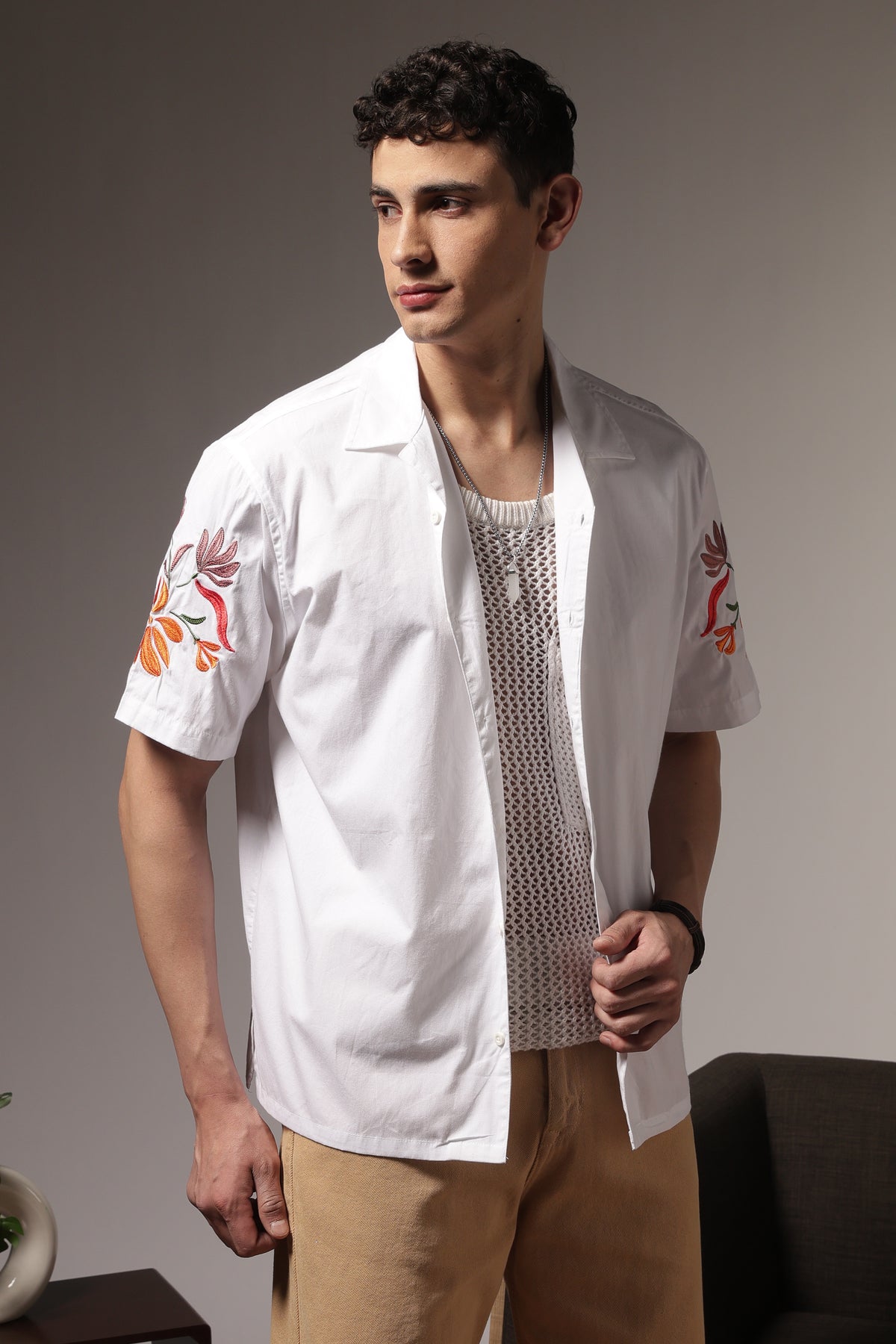 The standout feature of this shirt is its stunning floral embroidery, meticulously stitched to perfection. Each flower and leaf intricately detailed, adding a touch of sophistication to its relaxed silhouette.