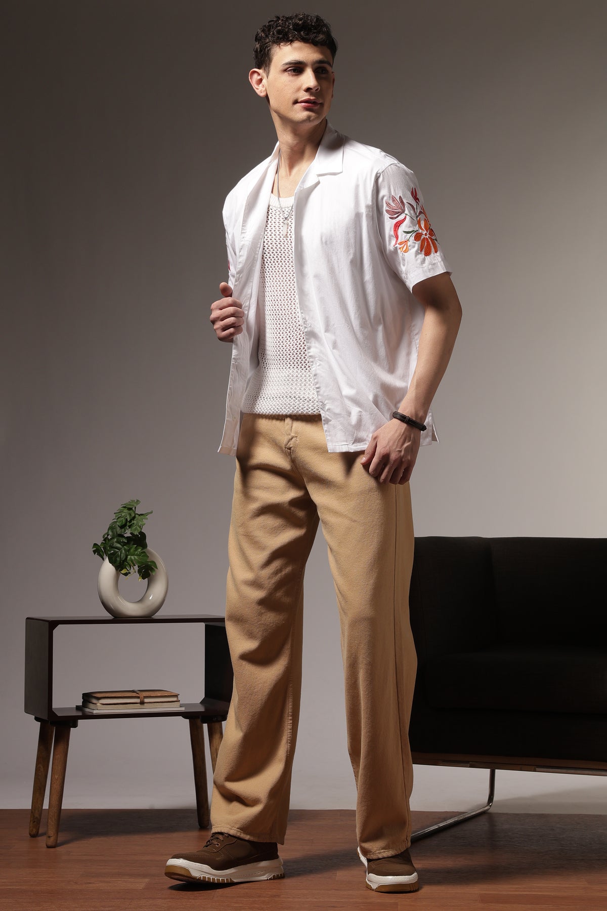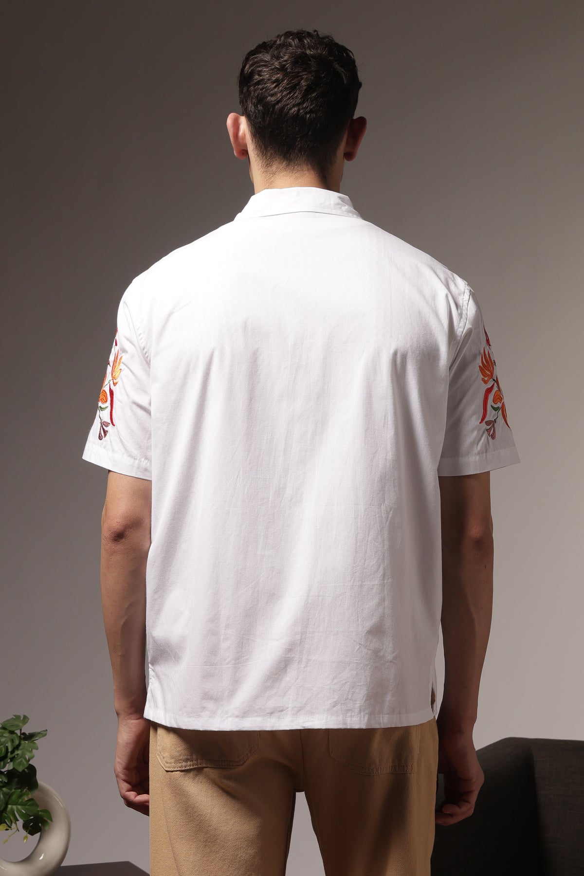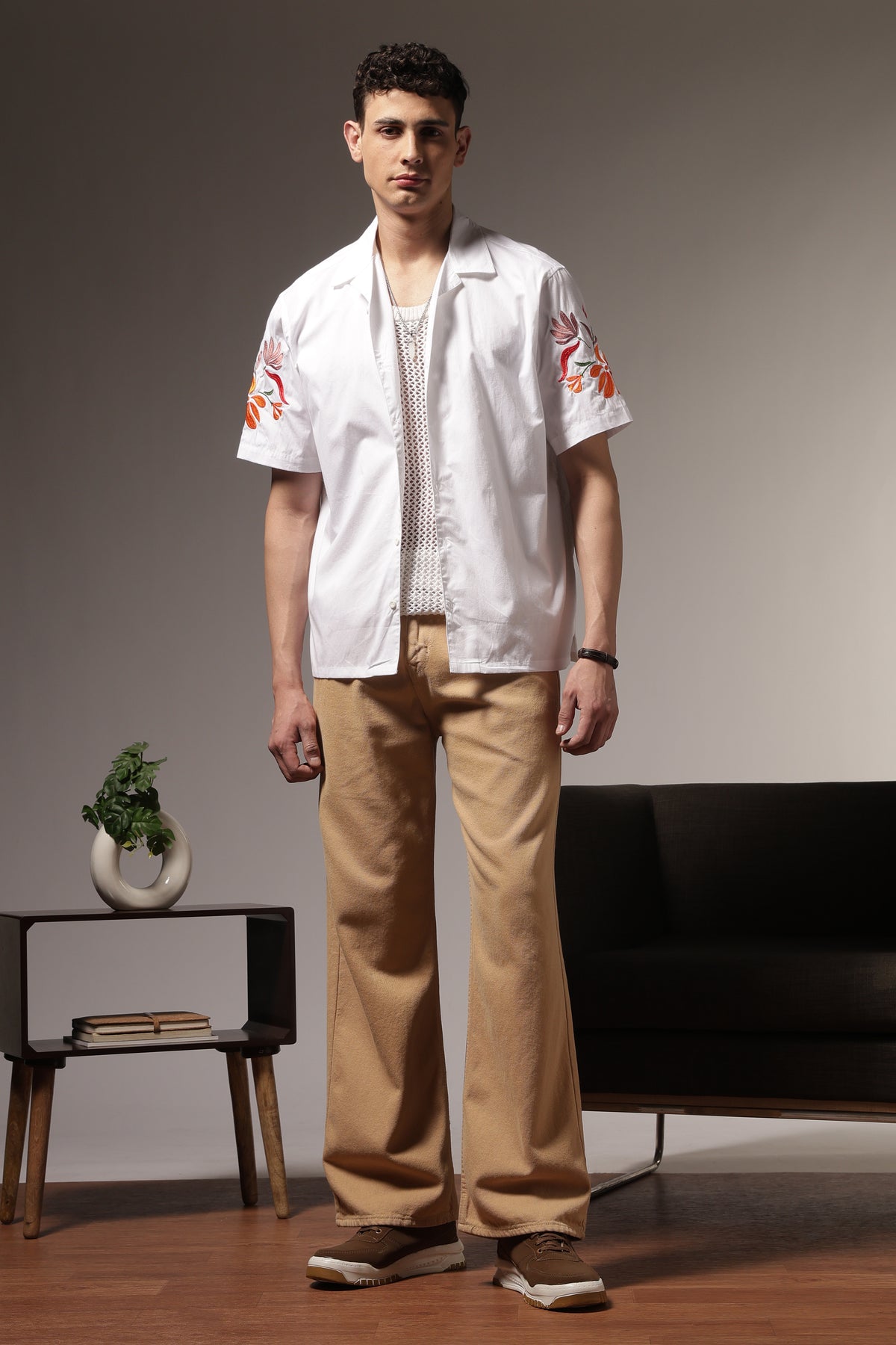 The standout feature of this shirt is its stunning floral embroidery, meticulously stitched to perfection. Each flower and leaf intricately detailed, adding a touch of sophistication to its relaxed silhouette.